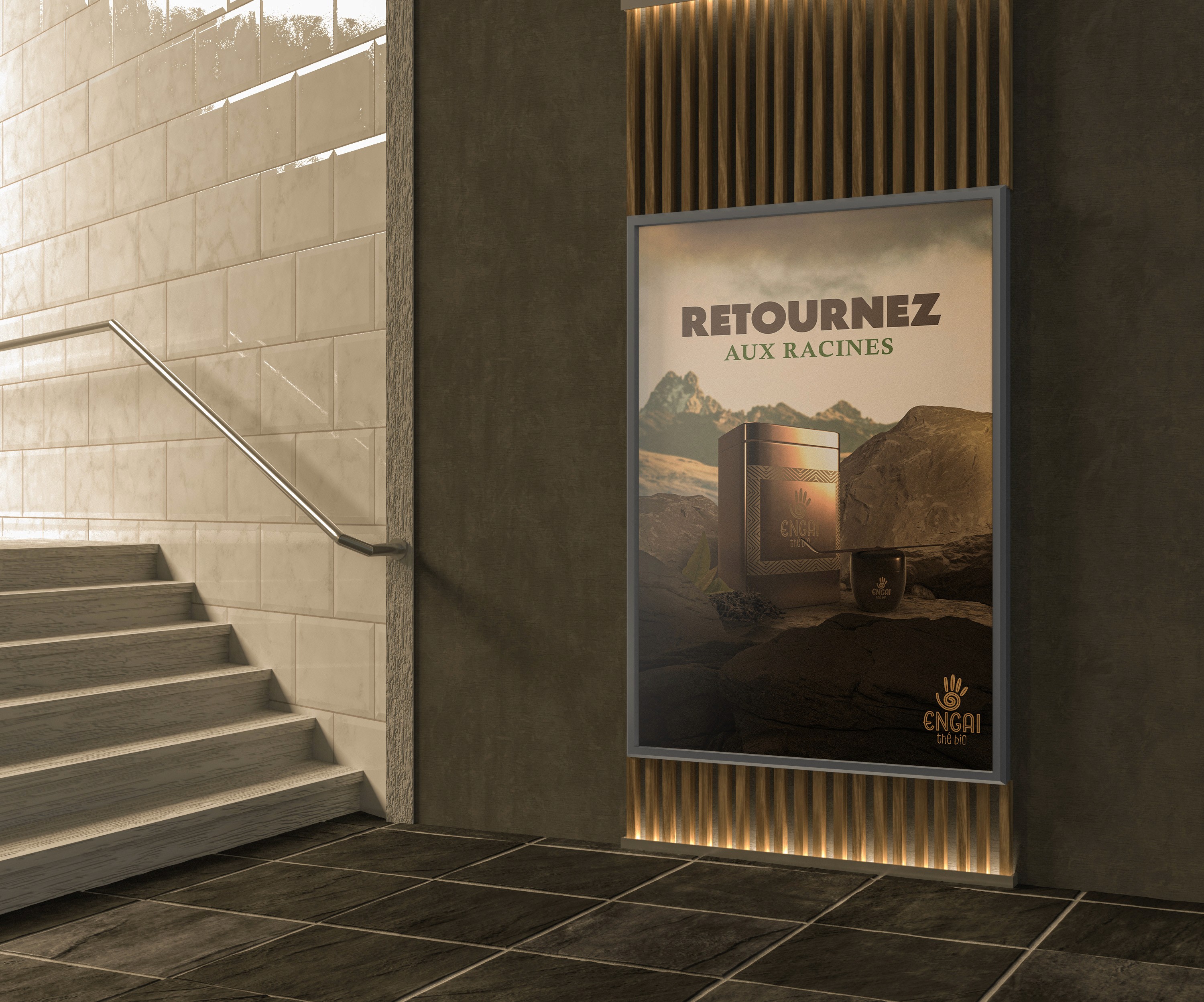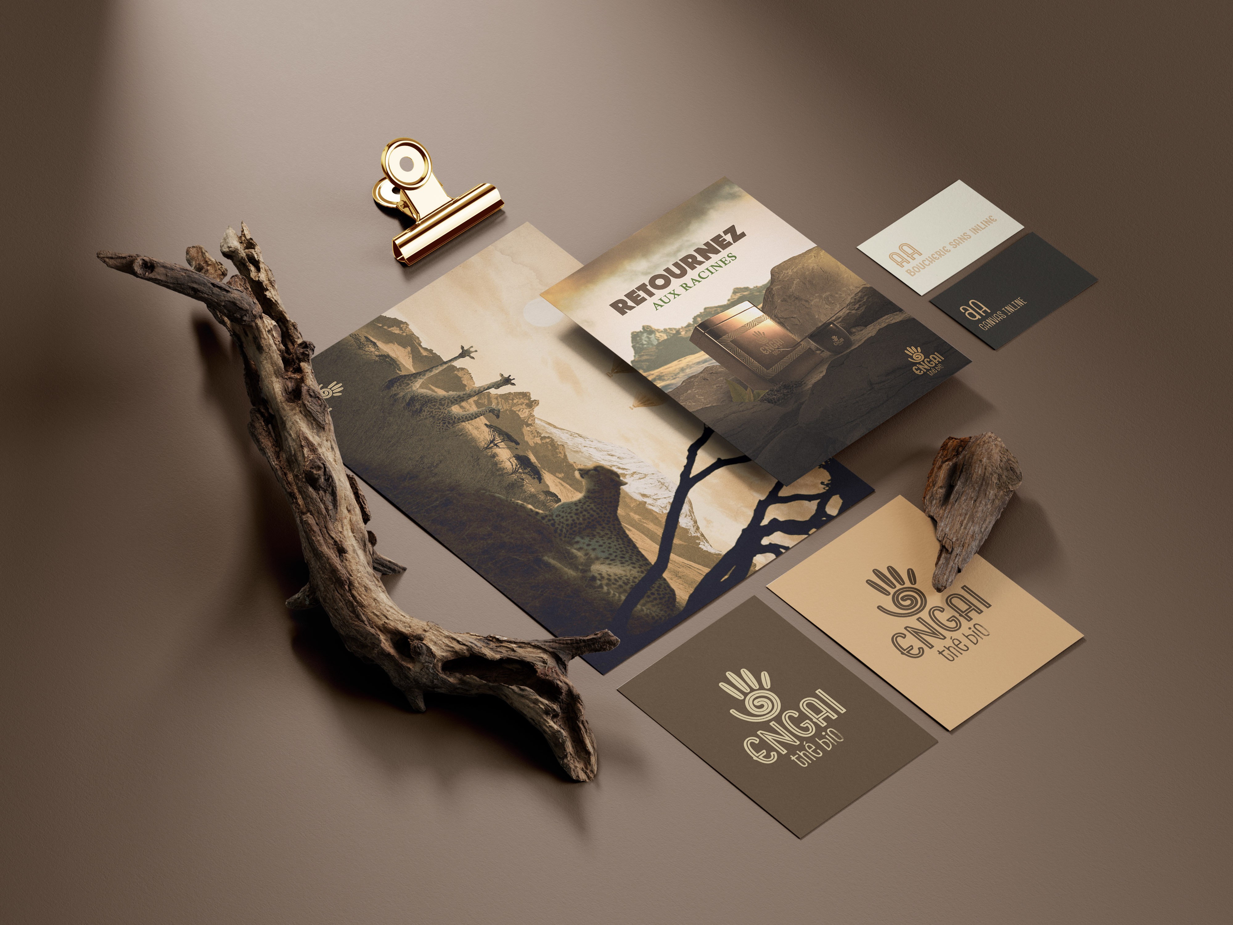 Nous étions chargés de créer une marque fictive de thé, de la provenance de notre choix. J’ai choisi le kenya, pour ses paysages spectaculaires et la richesse de sa faune et flore. Dans les légendes Massai, «Engai» est le nom d’une divinité créatrice, symbolisant l’harmonie de la nature. J’ai décidé d’en faire mon nom de marque, pour exprimer une volonté de respect de l’environnement et des hommes. Engai se veut engagé dans une production durable et éthique.