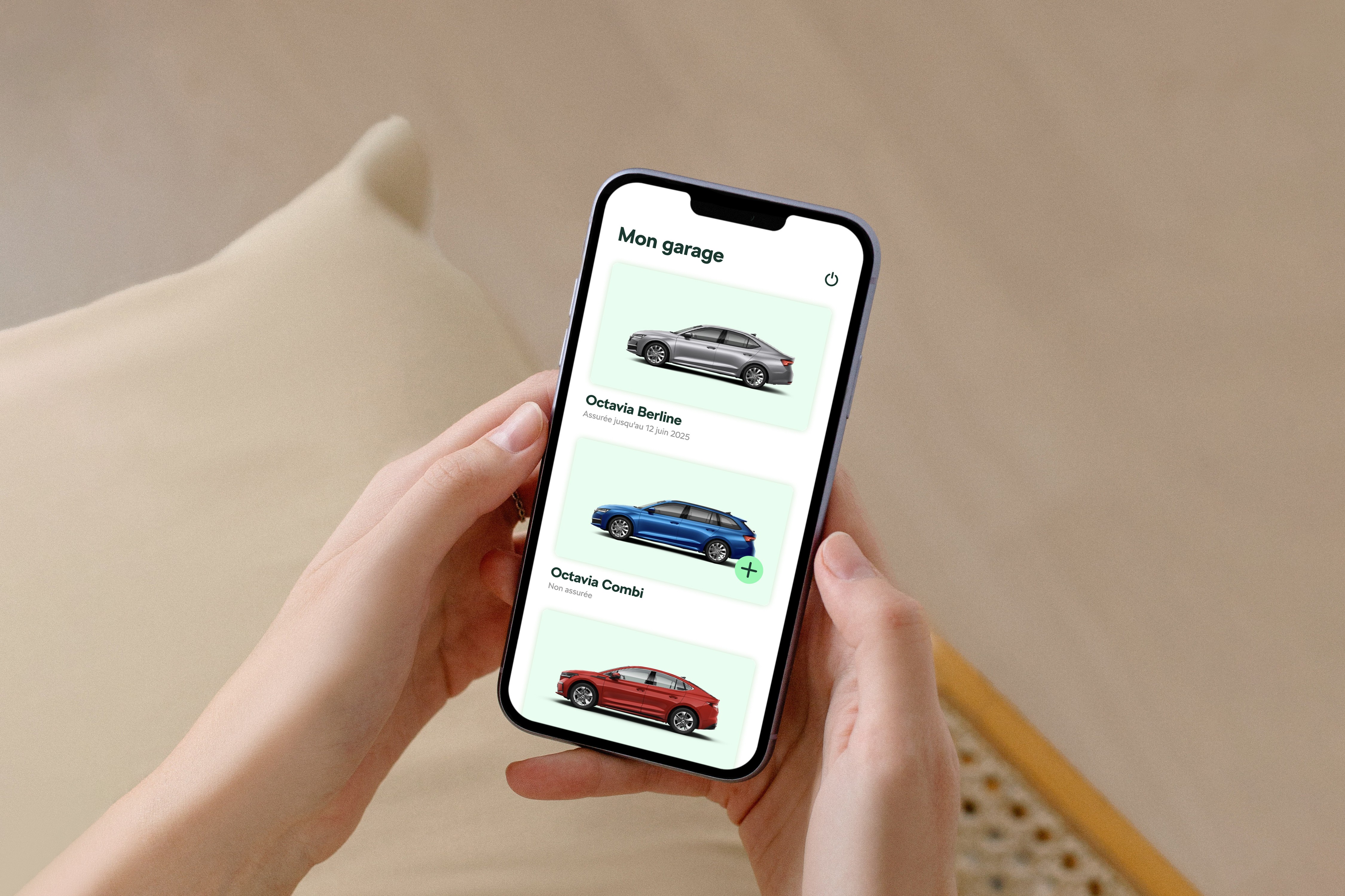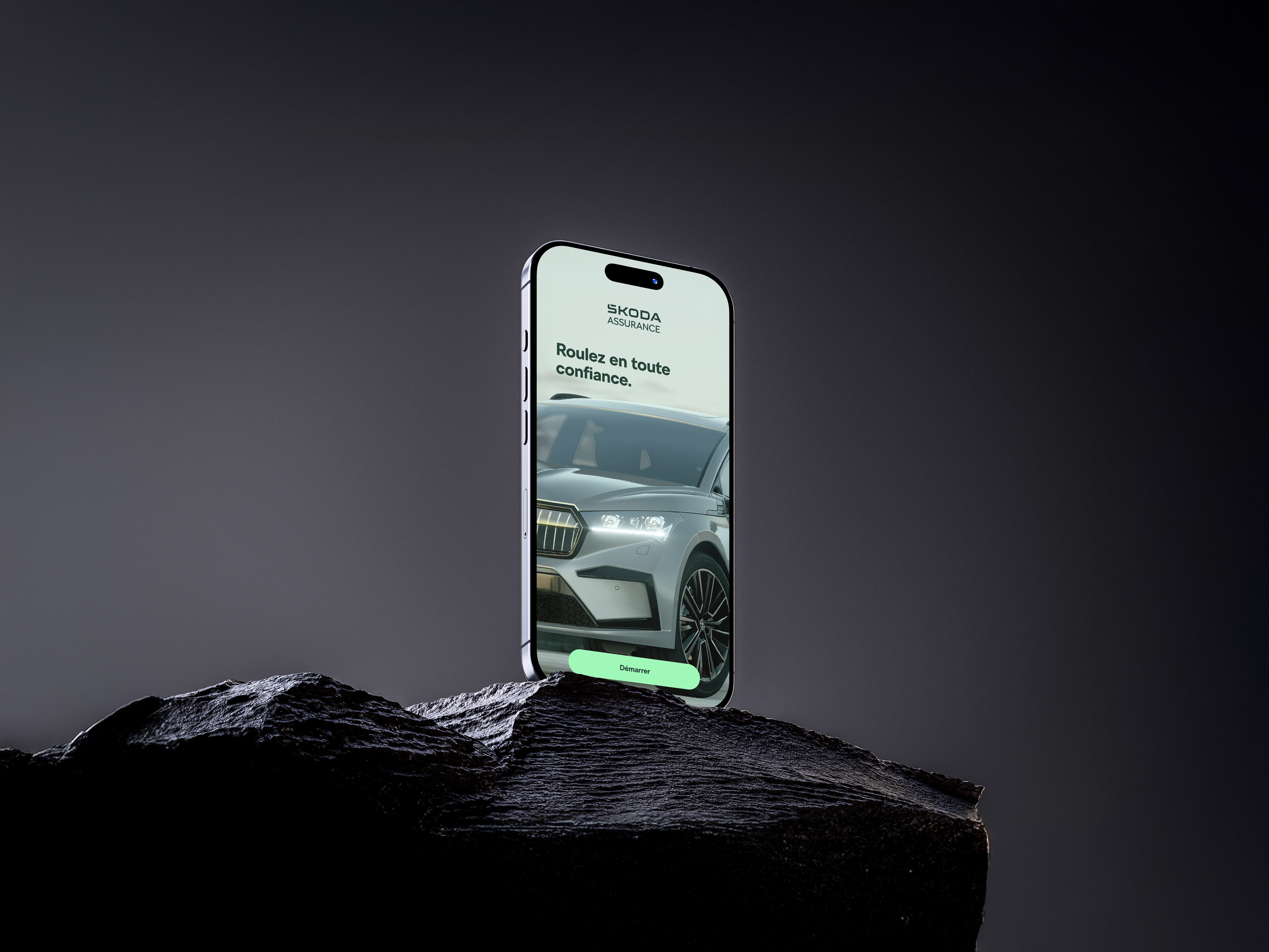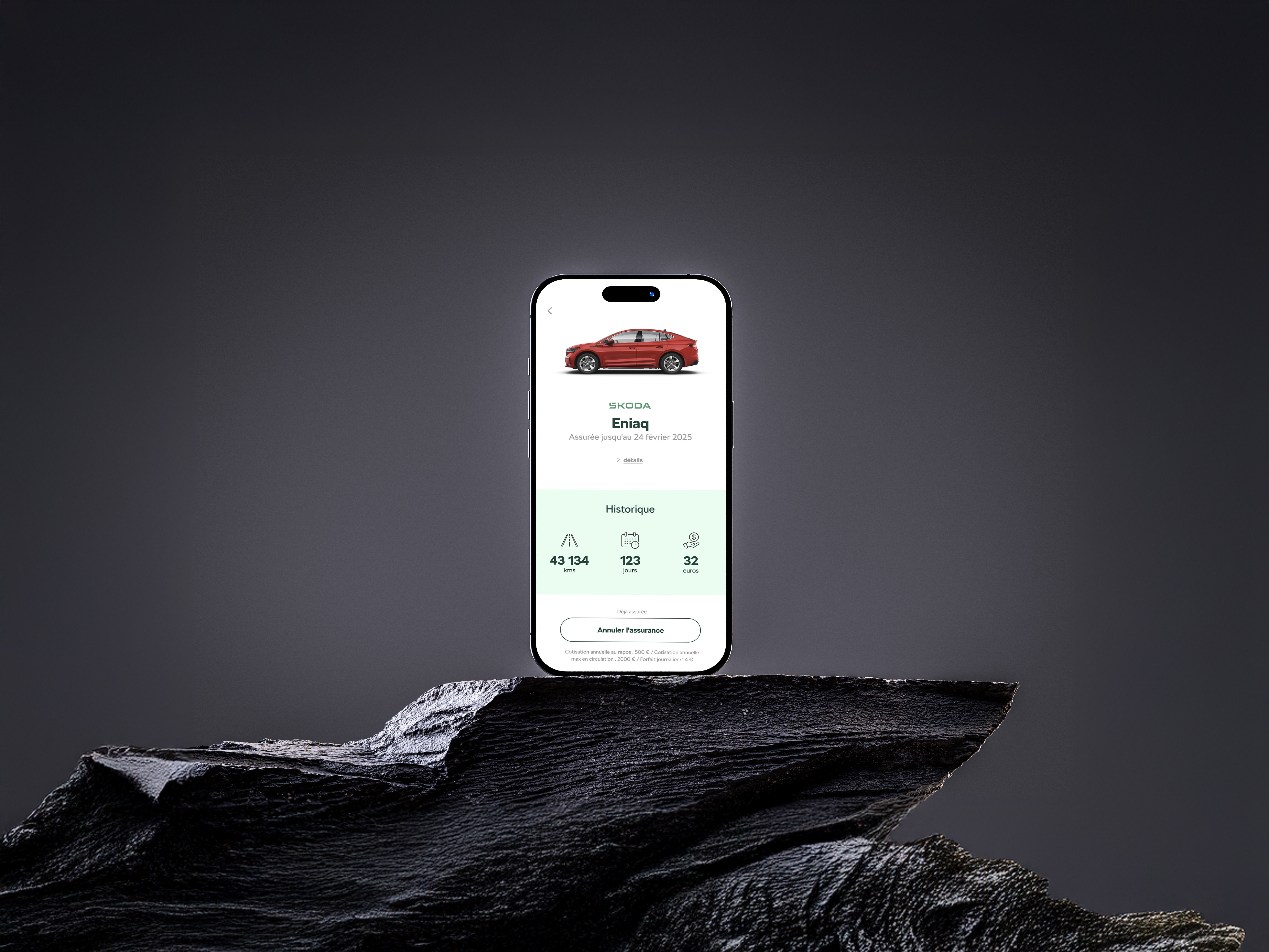 Un assureur souhaite développer une application d'assurance de véhicule en marque blanche. Ses fonctionnalités permettront au client d'assurer sa voiture uniquement quand elle est utilisée. À travers une application en marque blanche, l'assureur veut avoir la possibilité de vendre son produit à différentes marques. C'est aux couleurs de Škoda qu'a été réalisée l'application.